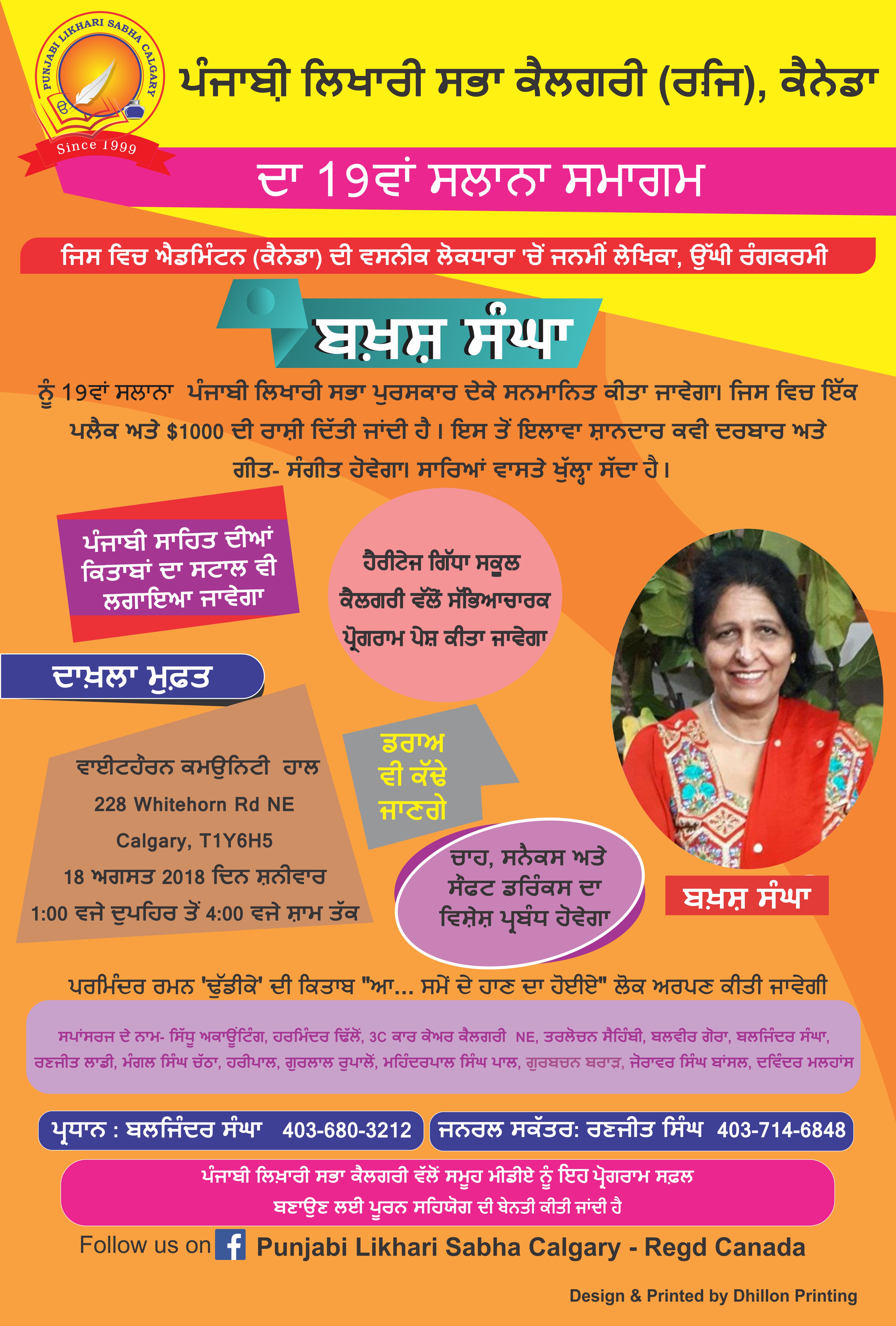 ਜੋਰਾਵਰ ਬਾਂਸਲ – ਪੰਜਾਬੀ ਲਿਖ਼ਾਰੀ ਸਭਾ ਕੈਲਗਰੀ, ਕੈਨੇਡਾ ਸੰਸਾਰ ਪੱਧਰ ਦੀਆਂ ਪੰਜਾਬੀ ਸਾਹਿਤਕ ਸੰਸਥਾਵਾਂ ਵਿੱਚ ਵਿਸ਼ੇਸ਼ ਸਥਾਨ ਰੱਖਦੀ ਹੈ,1999 ਤੋਂ ਲਗਾਤਾਰ ਮਹੀਨਾਵਾਰ poster july10,18ਸਾਹਿਤਕ ਇਕੱਤਰਤਾਵਾਂ ਅਤੇ ਸਾਲ 2000 ਤੋਂ ਸਲਾਨਾ ਸਮਾਗਮ ਲਗਾਤਾਰ ਕਰਦੀ ਆ ਰਹੀ ਹੈ। ਸਲਾਨਾ ਸਮਾਗਮ ਵਿਚ ਪੰਜਾਬੀ ਸਾਹਿਤ ਅਤੇ ਸਮਾਜ ਲਈ ਨਿੱਗਰ ਅਤੇ ਉਸਾਰੂ ਕੰਮ ਕਰਨ ਵਾਲੇ ਇੱਕ ਲੇਖਕ/ਲੇਖਿਕਾ ਨੂੰ ਸਲਾਨਾ ਪੁਰਸਕਾਰ ਪ੍ਰਦਾਨ ਕੀਤਾ ਜਾਂਦਾ ਹੈ। ਪਹਿਲਾ ਪੁਰਸਕਾਰ ਸਵ:ਸ੍ਰੋਮਣੀ ਸਾਹਿਤਕਾਰ ਗਿਆਨੀ ਕੇਸਰ ਸਿੰਘ ਨਾਵਲਿਸਟ ਨੂੰ ਸਾਲ 2000 ਵਿਚ ਦਿੱਤਾ ਗਿਆ ਸੀ। ਹੁਣ 19ਵਾਂ ਪੁਰਸਕਾਰ ਕੈਨੇਡਾ ਵਿਚ ਰਹਿਕੇ ਸਖ਼ਤ ਕਿਰਤੀ ਮਿਹਨਤ ਦੇ ਨਾਲ-ਨਾਲ ਸਾਹਿਤ ਅਤੇ ਸਮਾਜ ਲਈ ਉਸਾਰੂ ਯੋਗਦਾਨ ਪਾਉਣ ਵਾਲੀ ਲੇਖਿਕਾ ਅਤੇ ਅਲਬਟਾ ਸੂਬੇ ਵਿਚ ਪੰਜਾਬੀਆਂ ਦੇ ਅਗਾਂਹਵਧੂ ਨਾਟਕ ਮੰਚ ਵਿਚ ਲੰਬੇ ਸਮੇਂ ਤੋਂ ਲਗਾਤਾਰ ਆਪਣੇ ਨਿੱਜੀ ਰੁਝੇਵਿਆਂ ਦੇ ਬਾਵਜ਼ੂਦ ਹਰ ਹਲਾਤ,ਹਰ ਸਮੇਂ ਸਿਦਕ ਨਾਲ ਵੱਖ-ਵੱਖ ਪਾਤਰਾਂ ਰਾਹੀਂ ਅਲਬਰਟਾ ਸੂਬੇ ਵਿਚ ਪੇਸ਼ ਹੋਣ ਵਾਲੀ ਪਹਿਲੀ ਪੰਜਾਬੀ ਰੰਗਕਰਮੀ ਬਖ਼ਸ਼ ਸੰਘਾ ਵਾਸੀ ਐਡਮਿੰਟਨ ਨੂੰ ਦਿੱਤਾ ਜਾਵੇਗਾ। ਵਾਈਟਹੌਰਨ ਕਮਿਊਨਟੀ ਹਾਲ ਵਿਚ 18 ਅਗਸਤ ਦਿਨ ਸ਼ਨਿੱਚਰਵਾਰ ਨੂੰ ਇਹ ਸਮਾਗਮ 1 ਤੋਂ 4 ਵਜੇ ਤੱਕ ਹੋਵੇਗਾ। ਪਰਮਿੰਦਰ ਰਮਨ ਢੁੱਡੀਕੇ ਦੀ ਕਾਵਿ ਪੁਸਤਕ ਲੋਕ ਅਰਪਣ ਕੀਤੀ ਜਾਵੇਗੀ, ਪੁਸਤਕਾਂ ਦਾ ਸਟਾਲ ਲਗਾਇਆ ਜਾਵੇਗਾ, ਹੈਰੀਟੇਜ ਗਿੱਧਾ ਸਕੂਲ ਵੱਲੋਂ ਸੱਭਿਆਚਾਰਕ ਸਮਾਗਮ ਪੇਸ਼ ਕੀਤਾ ਜਾਵੇਗਾ, ਵੱਖ-ਵੱਖ ਸ਼ਹਿਰਾਂ ਤੋਂ ਵੀ ਲੇਖਕ ਸ਼ਮੂਲੀਅਤ ਕਰਨਗੇ। ਹਰ ਹਾਜ਼ਰੀਨ ਲਈ ਚਾਹ ਅਤੇ ਸਨੈਕਸ ਦਾ ਵਿਸ਼ੇਸ਼ ਪ੍ਰਬੰਧ ਹੋਵੇਗਾ। ਮੌਜੂਦਾ ਪ੍ਰਧਾਨ ਬਲਜਿੰਦਰ ਸੰਘਾ ਅਤੇ ਜਨਰਲ ਸਕੱਤਰ ਰਣਜੀਤ ਸਿੰਘ ਅਨੁਸਾਰ ਇਹ ਸਭਾ ਸਖ਼ਤ ਨਿਯਮਾਂ ਅਨੁਸਾਰ ਚੱਲਦੀ ਹੈ ਨਾ ਕਿ ਕਿਸੇ ਇੱਕ ਵਿਆਕਤੀ ਦੇ ਅਧਾਰਿਤ। ਸਭ ਫੈਸਲੇ ਕਾਰਜਕਾਰੀ ਕਮੇਟੀ ਦੀ ਬਹੁਮਤ ਨਾਲ ਹੁੰਦੇ ਹਨ। ਹਰ ਕਾਰਜਕਾਰੀ ਮੈਂਬਰ ਸਖ਼ਤ ਨਿਯਮਾਂ ਵਿਚ ਬੱਝਿਆ ਹੋਇਆ ਹੈ। ਜਿਵੇਂ ਕਿ ਸਾਲ ਦਾ ਪੰਜ ਸੌ ਡਾਲਰ ਸਭਾ ਦੇ ਖ਼ਾਤੇ ਵਿਚ ਜਮਾਂ ਕਰਵਾਉਂਦਾ ਹੈ, ਸੌਂਪੀ ਜਿੰਮੇਵਾਰੀ ਨਾ ਨਿਭਾਉਣ ਤੇ ਕਾਰਜਕਾਰੀ ਮੈਂਬਰ ਬਹੁਮਤ ਨਾਲ ਕਿਸੇ ਵੀ ਕਾਰਜਕਾਰੀ ਮੈਂਬਰ ਨੂੰ ਬਰਖ਼ਾਸਤ ਕਰ ਸਕਦੇ ਹਨ। ਰਾਜਨੀਤਕ ਜਾਂ ਸਭਾ ਦਾ ਹੋਰ ਨਿੱਜੀ ਲਾਭ ਲੈਣ ਵਾਲੇ ਤੋਂ ਅਸਤੀਫ਼ਾ ਲਿਆ ਜਾਂਦਾ ਹੈ ਜਾਂ ਬਹੁਮਤ ਨਾਲ ਬਾਹਰ ਦਾ ਰਸਤਾ ਦਿਖਾਇਆ ਜਾਂਦਾ ਹੈ। ਕੋਈ ਕਿਤਾਬ ਤਾਂ ਹੀ ਲੋਕ ਅਰਪਣ ਕੀਤੀ ਜਾ ਸਕਦੀ ਹੈ ਜੇਕਰ ਸਭਾ ਦੇ ਘੱਟੋ-ਘੱਟ ਚਾਰ ਕਾਰਜਕਾਰੀ ਮੈਂਬਰ ਕਿਤਾਬ ਪੜ੍ਹਨ ਤੋਂ ਬਾਅਦ ਆਪਣੀ ਸਹਿਮਤੀ ਦੇਣ ਆਦਿ। ਜ਼ਿਕਰਯੋਗ ਹੈ ਕਿ ਗਿਆਨੀ ਕੇਸਰ ਸਿੰਘ ਨਾਵਲਿਸਟ ਦੇ ਸਨਮਾਨ ਤੋਂ ਸ਼ੁਰੂ ਹੋਕੇ ਹੁਣ ਤੱਕ ਸਭਾ ਸਵ:ਸ੍ਰੋਮਣੀ ਕਵੀਸ਼ਰ ਕਰਨੈਲ ਸਿੰਘ ਪਾਰਸ,ਸ੍ਰੋਮਣੀ ਸਾਹਿਤਕਾਰ ਗੁਰਚਰਨ ਰਾਮਪੁਰੀ, ਜੋਗਿੰਦਰ ਸ਼ਮਸ਼ੇਰ, ਸਵ:ਡਾ ਦਰਸ਼ਨ ਗਿੱਲ,ਸ੍ਰੋਮਣੀ ਸਾਹਿਤਕਾਰ ਨਵਤੇਜ ਭਾਰਤੀ, ਬਲਵੀਰ ਕੌਰ ਸੰਘੇੜਾ, ਨਦੀਮ ਪਰਮਾਰ,ਸਵ:ਇਕਬਾਲ ਰਾਮੂਵਾਲੀਆ, ਜਰਨੈਲ ਸੇਖਾ, ਜਰਨੈਲ ਸਿੰਘ ਕਹਾਣੀਕਾਰ, ਸਾਧੂ ਬਿਨਿੰਗ, ਮੰਗਾ ਬਾਸੀ, ਅਜਮੇਰ ਰੋਡੇ, ਮੋਹਨ ਗਿੱਲ, ਮੇਜਰ ਮਾਂਗਟ, ਮੁਹਿੰਦਰ ਸੂਮਲ ਜਿਹੇ ਸਮਾਜ ਨੂੰ ਸਮਰਪਿਤ ਅਤੇ ਲਿਖਣ ਕਲਾ ਨਾਲ ਜੁੜੀਆਂ ਹਸਤੀਆਂ ਦਾ ਸਨਮਾਨ ਕਰ ਚੁੱਕੀ ਹੈ। ਇਸ ਤੋਂ ਇਲਾਵਾ ਸਭਾ ਵੱਲੋਂ ਨਵੀਂ ਪੀੜ੍ਹੀ ਨੂੰ ਪੰਜਾਬੀ ਬੋਲੀ ਅਤੇ ਨਿੱਗਰ ਕਦਰਾਂ-ਕੀਮਤਾਂ ਨਾਲ ਜੋੜਨ ਲਈ 2012 ਤੋਂ ਹਰੇਕ ਇੱਕ ਪਰੋਗਰਾਮ ਸਿਰਫ਼ ਬੱਚਿਆਂ ਲਈ ‘ਪੰਜਾਬੀ ਬੋਲਣ